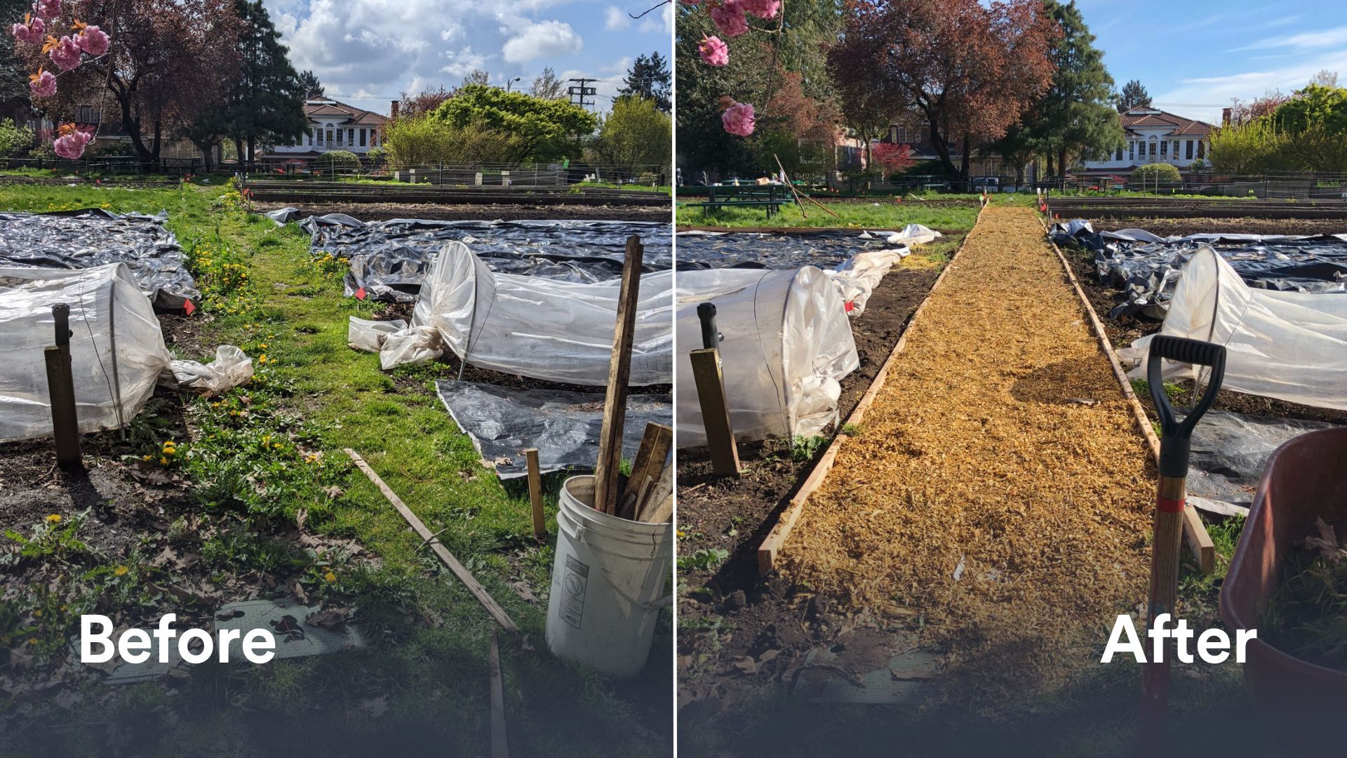 The pathways between garden beds were looking rather rough. Weeds and invasive plants were overgrowing from the pathway into the farm. And the rough, uneven ground wasn’t accessible for all students. The before and after pictures speak for themselves!