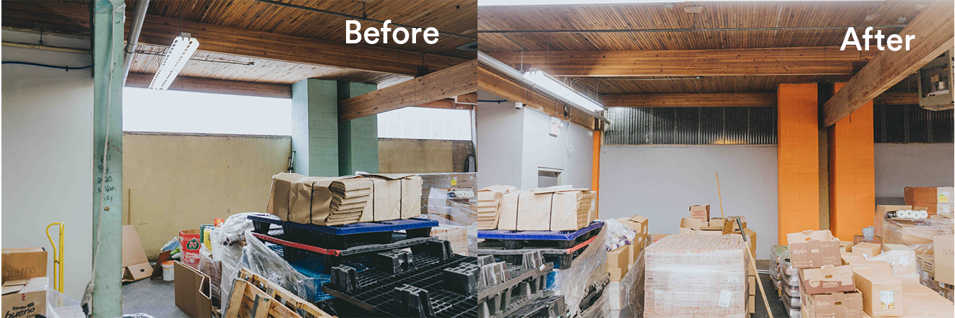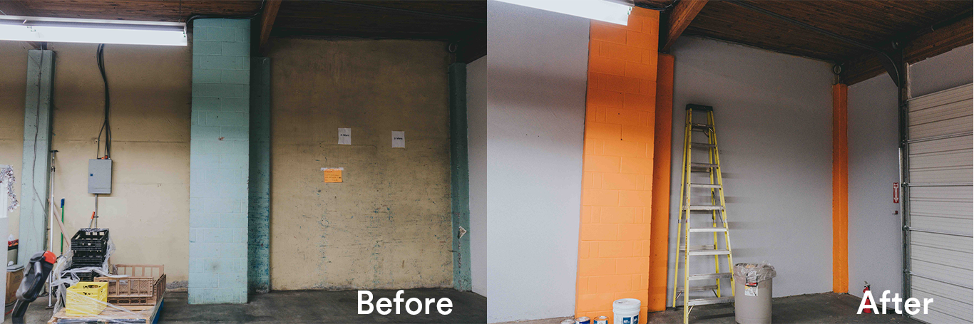 Over the past few months we’ve developed a wonderful relationship with Quest Food Exchange, a nonprofit dedicated to disrupting the cycle of poverty through access to healthy and affordable food that is sourced sustainably. As we toured there office we noticed that their warehouse, which is essentially the heart of their operation, was in rough shape. According to Janice, their director of Food Logistics, no work had been done on the warehouse since they took it over. Needless to say, it really needed a fresh coat of paint to liven up the place!