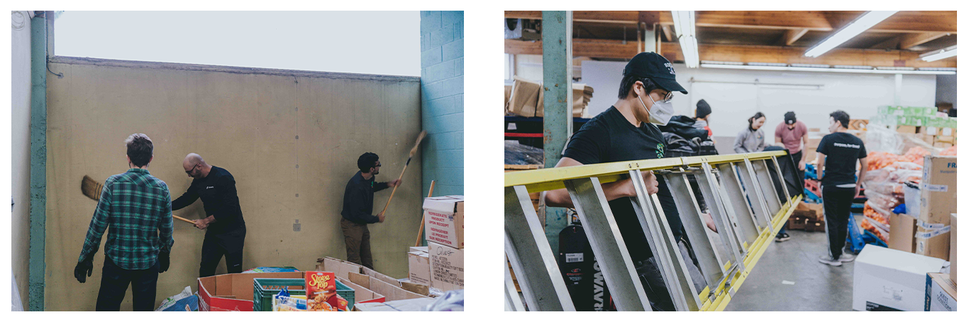 We brought together 20 people from 2 Vancouver companies to help brighten up the warehouse team’s space. With a quick demonstration, people were off to the races dusting down the walls, painting with rollers and brushes, edging, and sweeping the floors after we wrapped up.