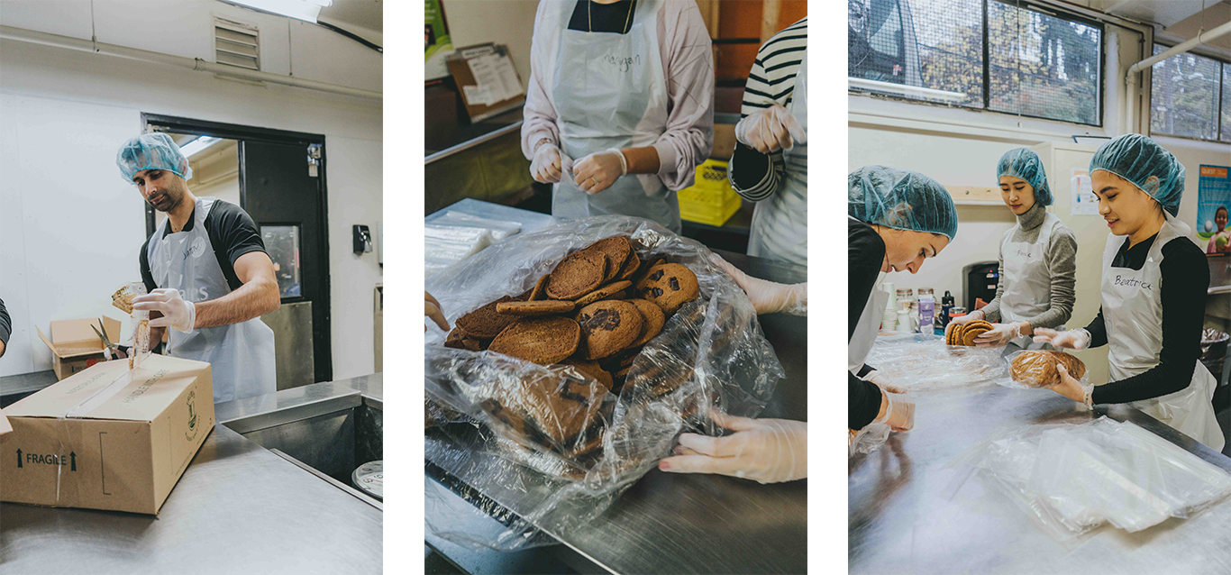 The team got to work by repacking a large supply of cookies that were generously donated by a local restaurant. The cookies were slightly different in size, making them unsuitable for the restaurant, but otherwise, these cookies were fresh and ready to eat! One of the great things about Quest is that food like this, rather than ending up in a landfill, can go to those who don’t have the means to buy it in a typical grocery store.